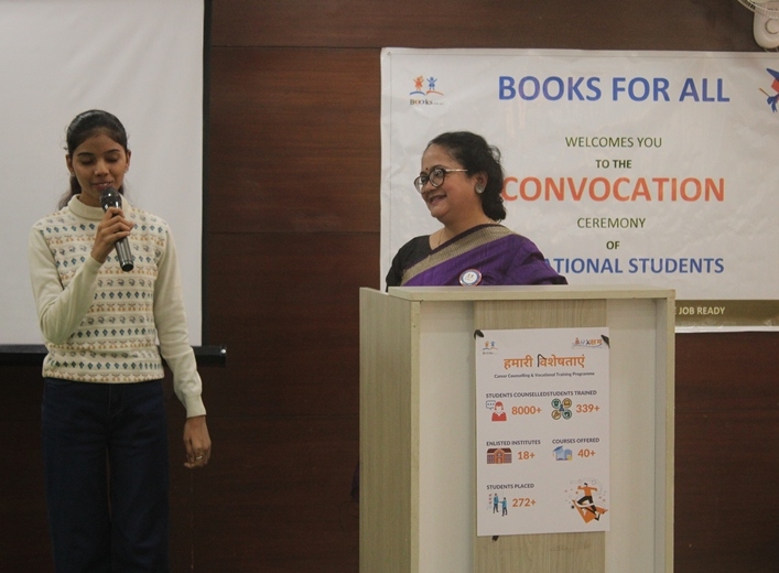 BFA helps students with admissions to selected institutes and mentors them till they complete the course and find employment. As of March 2025, BFA has provided career counselling to more than 7000 students and sponsored the vocational training of 393 impecunious students in 28 different courses from 11 reputed institutes. Of them 314 students have completed their respective courses. BFA helped 247 students, who had completed their courses, secure jobs. A majority of these students are girls.