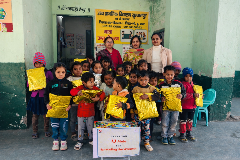 On 6th and 10th December, woollen items, lovingly packed and donated by Adobe volunteers, were distributed to 45 Anganwadi children in Sultanpur, giving them relief during the harsh winter season.